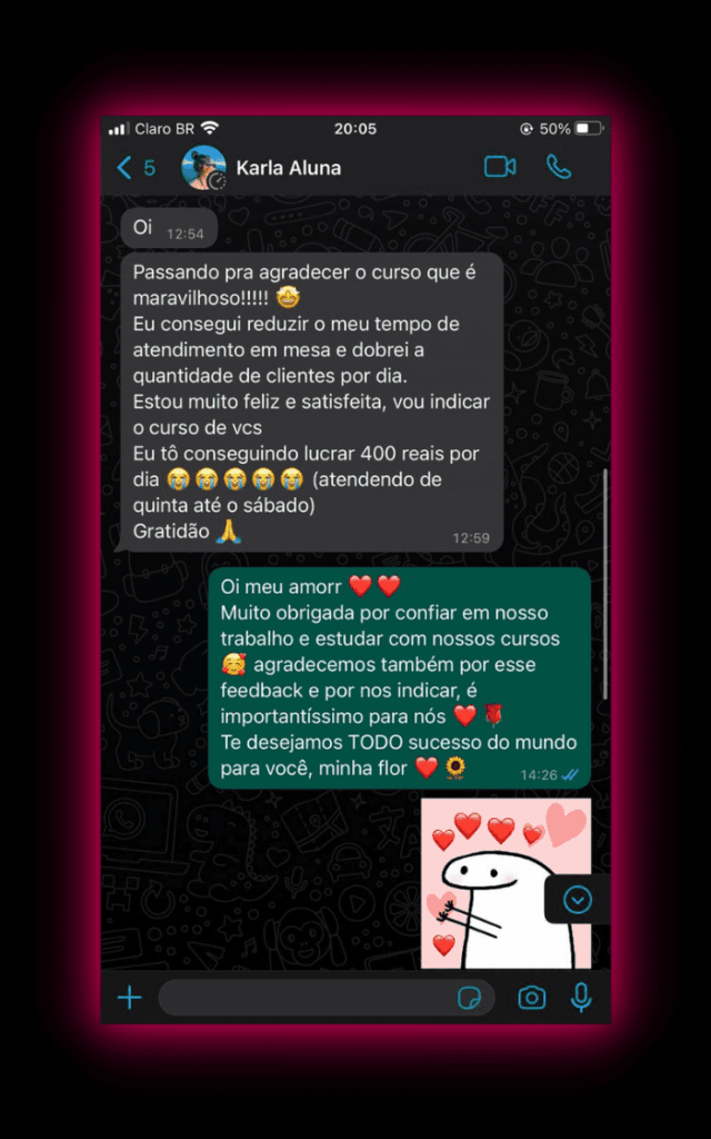 É um Grupo no Telegram, onde você vai poder Interagir com as outras Alunas do Curso, conversar sobre as coisas do Mundo das Unhas, sobre o Curso, mandar fotos dos seus trabalhos e pedir a opinião das outras alunas.